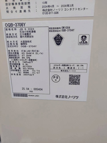 射水市荒町 ノーリツ石油小形給湯機OQB-3706Y 給湯器交換工事